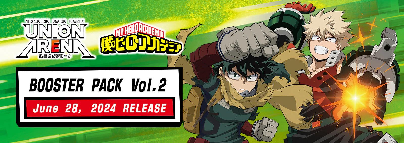 The Union Arena My Hero Academia Vol. 2 booster box (EX06BT), released in Japan on June 28, 2024, features 16 packs per box with 8 cards per pack. It focuses on Season 6 of the anime, introducing a new "yellow" color deck and strengthening existing attributes. Each box includes, on average, 8 types of Super Rare (SR), 12 Rares (R), 25 Uncommons (U), 28 Commons (C), and 6 AP cards, with rare parallel cards randomly included.